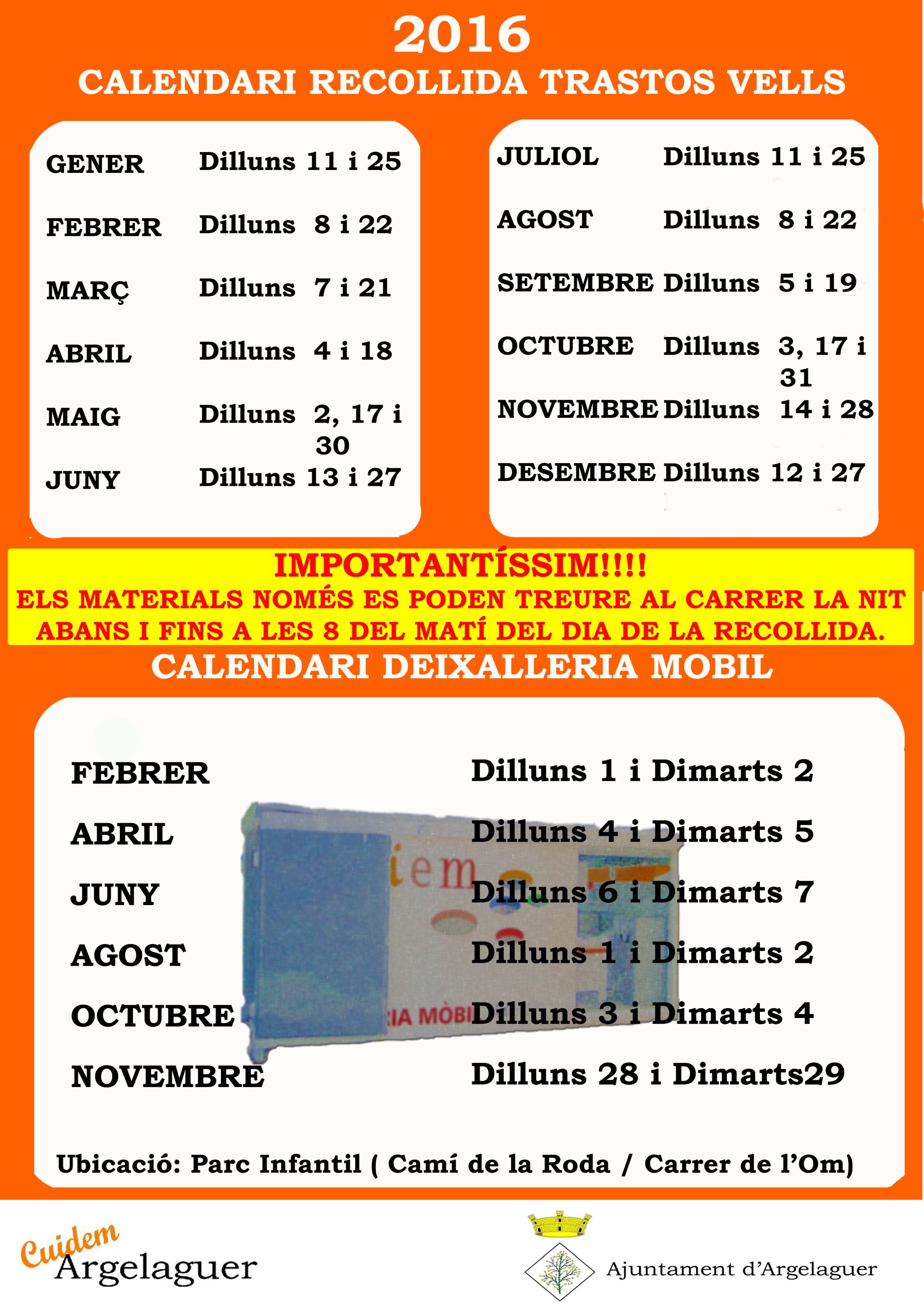 Nou calendari recollida trastos vells i deixalleria mòbil 2016. IMPORTANTÍSSIM!!! Els materials només es poden treure al carrer la nit abans i fins a les 8 del matí del dia de la recollida.